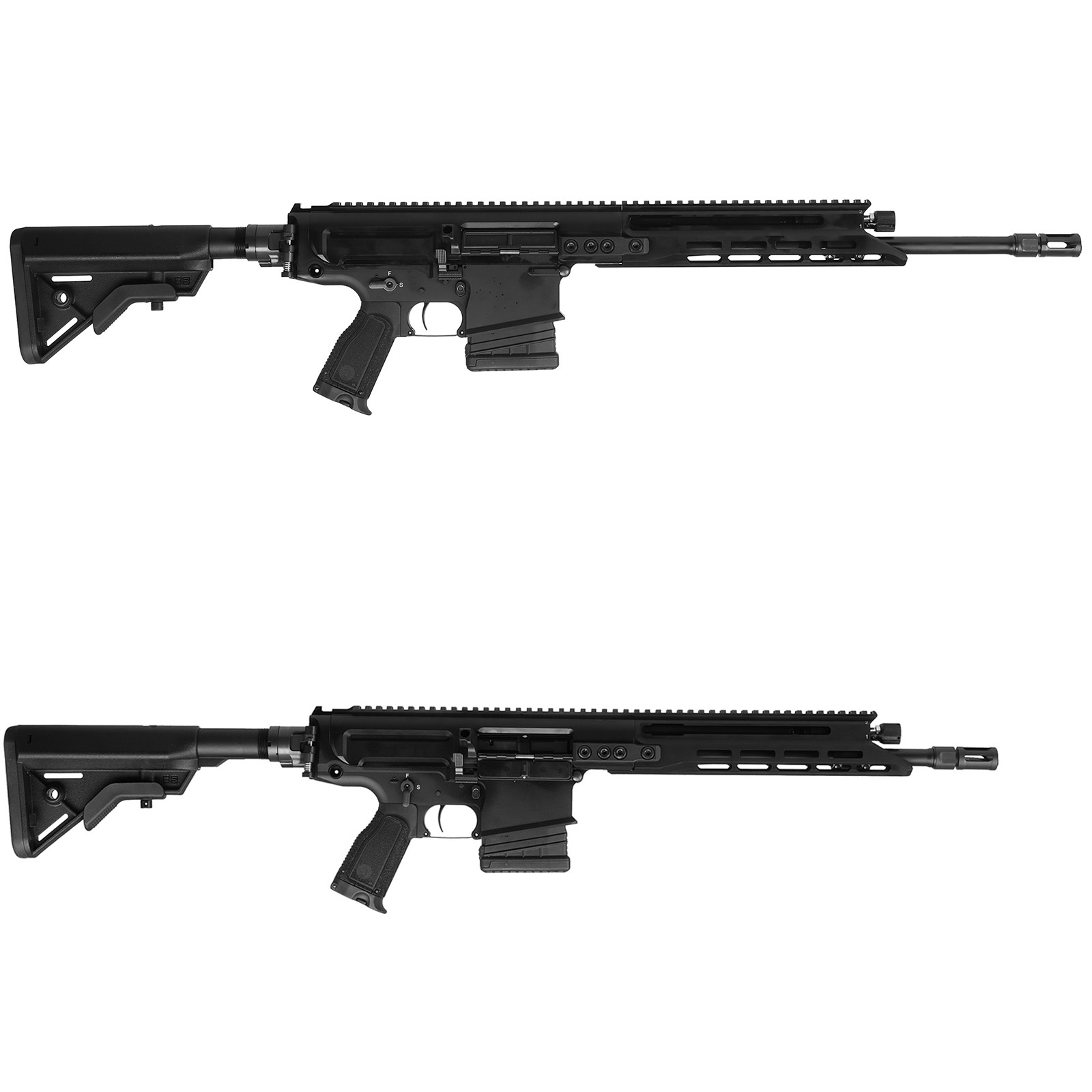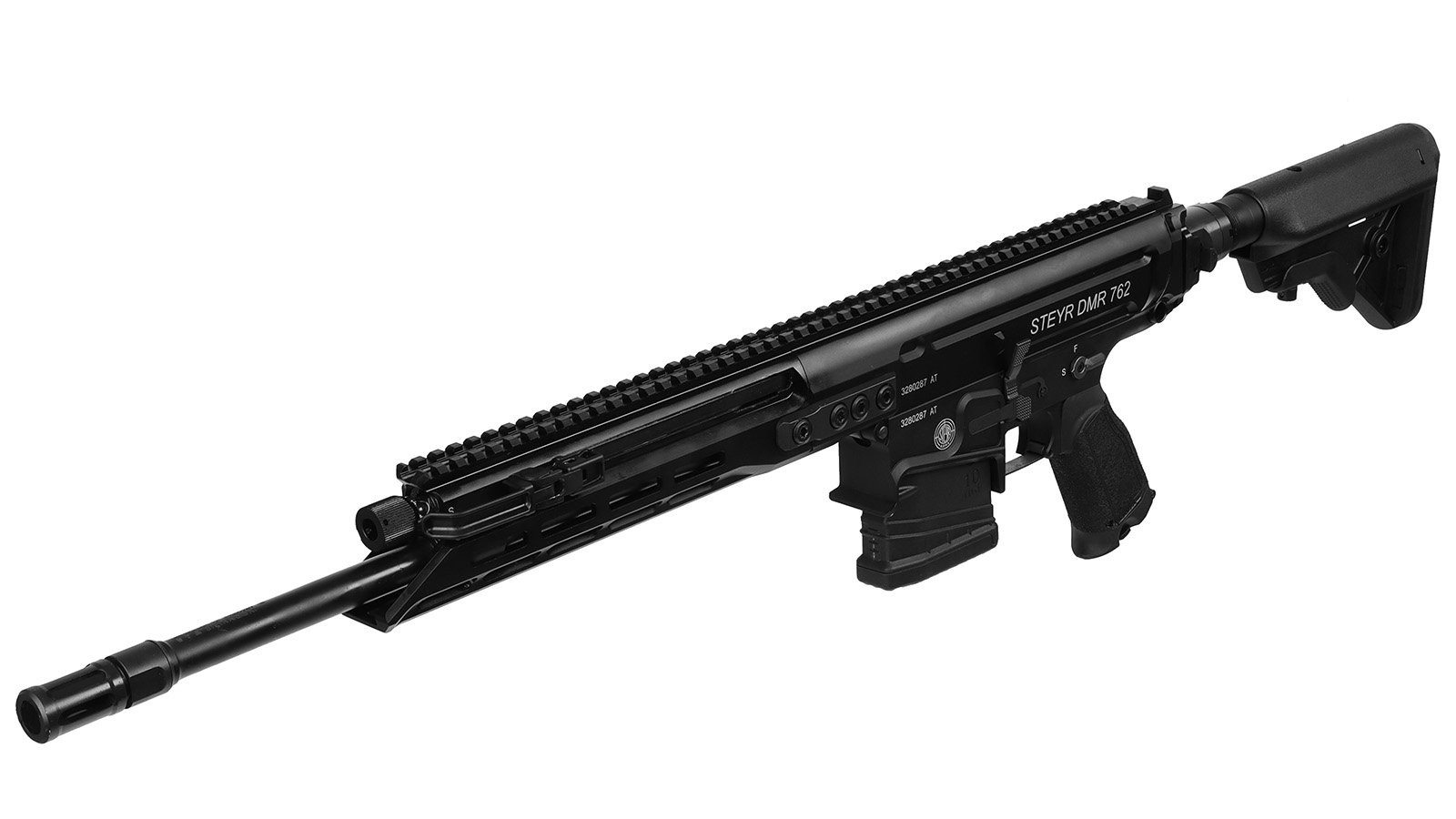 Das DMR ist eine Vollmetallwaffe mit einem Gesamtgewicht unter 4 kg und bringt eine Präzisionsleistung im Sub-MOA Bereich! Der in sechs Schritten um 82 mm verlängerbare Schaft lässt sich zusammenklappen um die Transportfähigkeit der Waffe zu erhöhen. Der vorne liegende Spannschieber kann werkzeuglos von rechts auf links umgebaut werden und dient auch als Schließhilfe. Die M-Lock Schlitze auf 3, 6 und 9 Uhr ermöglichen die Montage verschiedener Zieleinrichtungen.